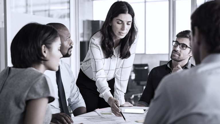 successful-female-business-team-lead-working-with-group-multiethnic-business-...